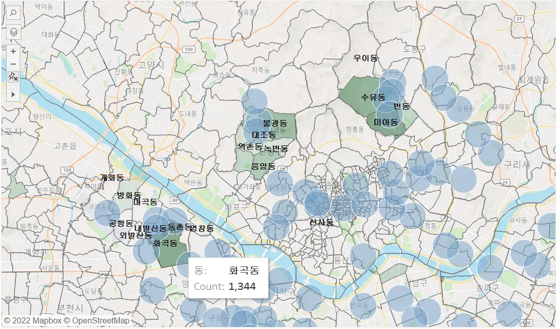서울시에서 제공하는 동 경계 shp 파일을 활용하여 맵 형태로 시각화