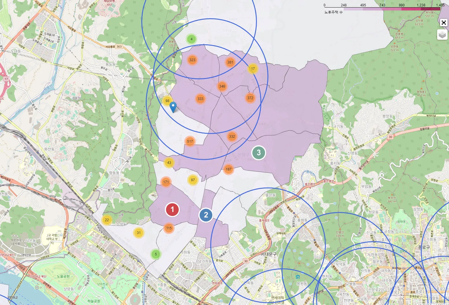 시각화 결과 은평구 신사2동(1), 응암3동(2), 녹번동(3) 이 응급 대처가 어렵고 노후 주택이 많아 폭염 피해에 취약하여 우선적으로 주거 환경 개선이 요구되는 지역으로 선정되었음