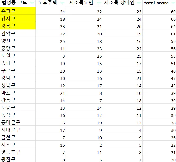 노후주택 수, 저소득 노인 수, 저소득 장애인 수를 기준으로 각각 랭크 부여(1~25등)