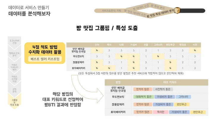 토크나이저 선정 > 형태소 빈도 분석 > 키워드 딕셔너리 제작 > 키워드 수치화 작업 > 군집 분석 > 그룹핑 및 특성도출